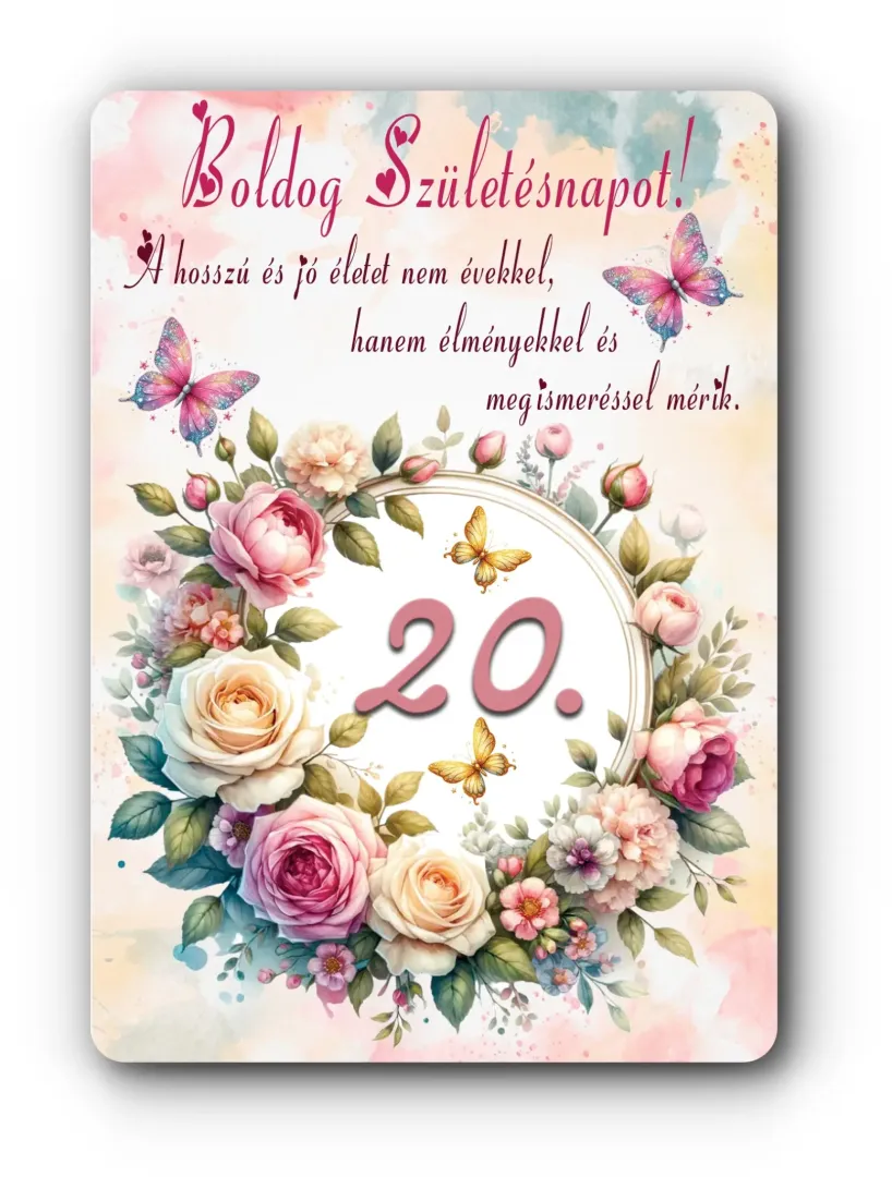 Tartós kartonból készült, matricázott felületű 10×15 cm-es hűtőmágnes. Dekoratív ajándék nőknek 20. születésnapra, praktikus kiegészítő hűtőre, fémfelületre.