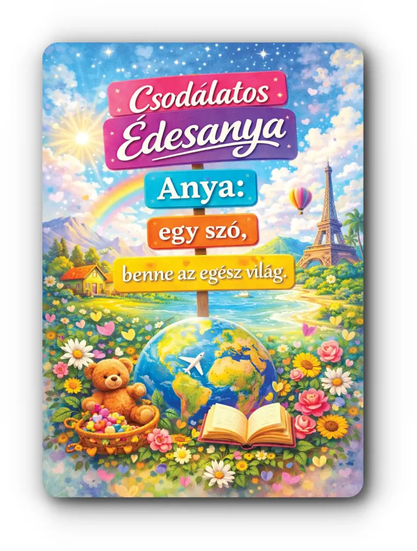 Tartós kartonból készült, matricázott felületű 10×15 cm-es hűtőmágnes. Dekoratív ajándék anyáknak, praktikus kiegészítő hűtőre, fémfelületre. Csodálatos édesanya felirattal és szöveggel.