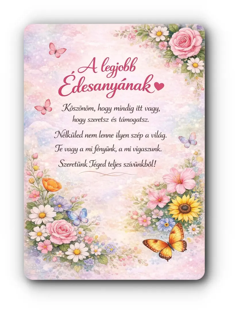 Tartós kartonból készült, matricázott felületű 10×15 cm-es hűtőmágnes. Dekoratív ajándék anyáknak, praktikus kiegészítő hűtőre, fémfelületre. A legjobb Anyának felirattal és szöveggel.