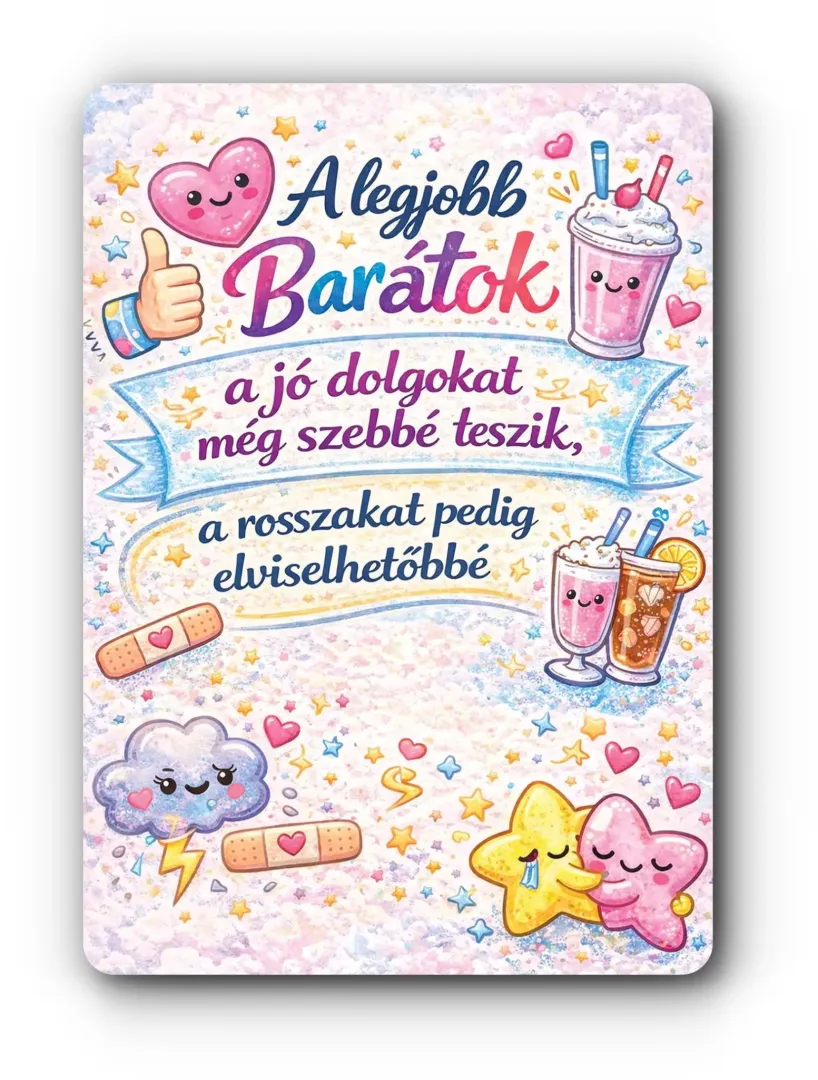 Tartós kartonból készült, matricázott felületű 10×15 cm-es hűtőmágnes. Dekoratív ajándék barátnak praktikus kiegészítő hűtőre, fémfelületre. A legjobb barátok felirattal.
