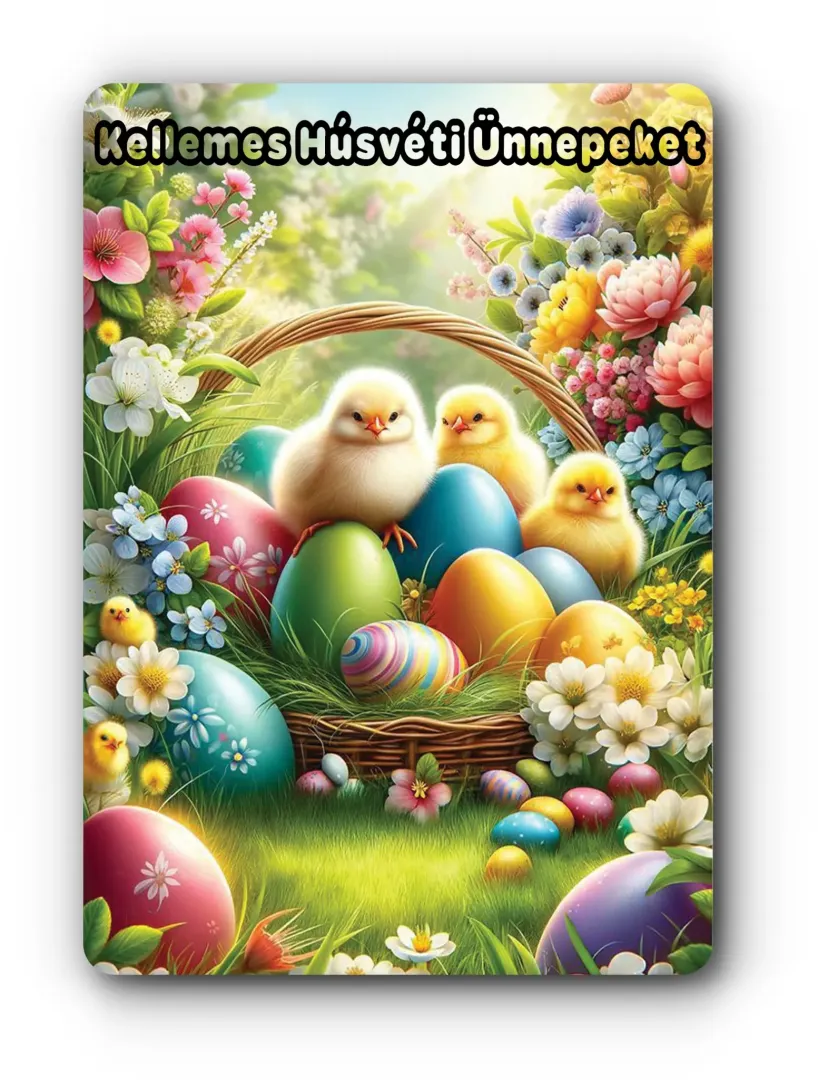 Tartós kartonból készült, matricázott felületű 10×15 cm-es hűtőmágnes. Dekoratív ajándék húsvétra, praktikus kiegészítő hűtőre, fémfelületre.
