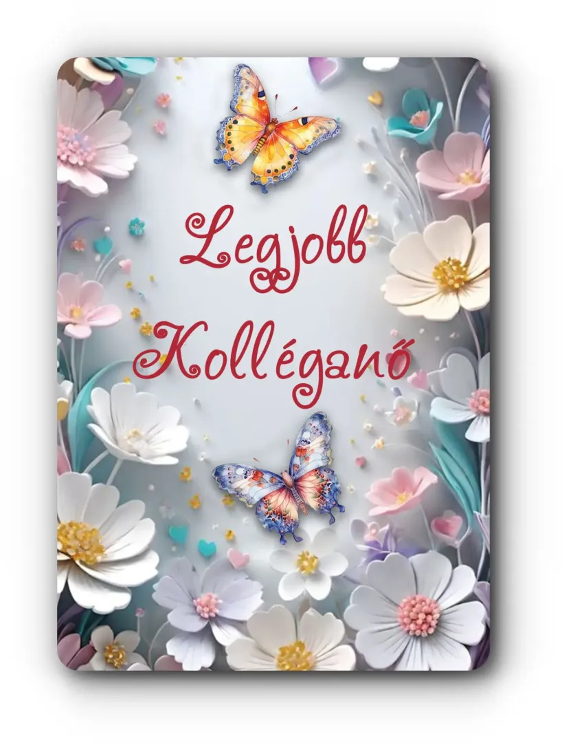 Tartós kartonból készült, matricázott felületű 10×15 cm-es hűtőmágnes. Dekoratív ajándék kolléganőnek, praktikus kiegészítő hűtőre, fémfelületre. Legjobb kolléganő felirattal.