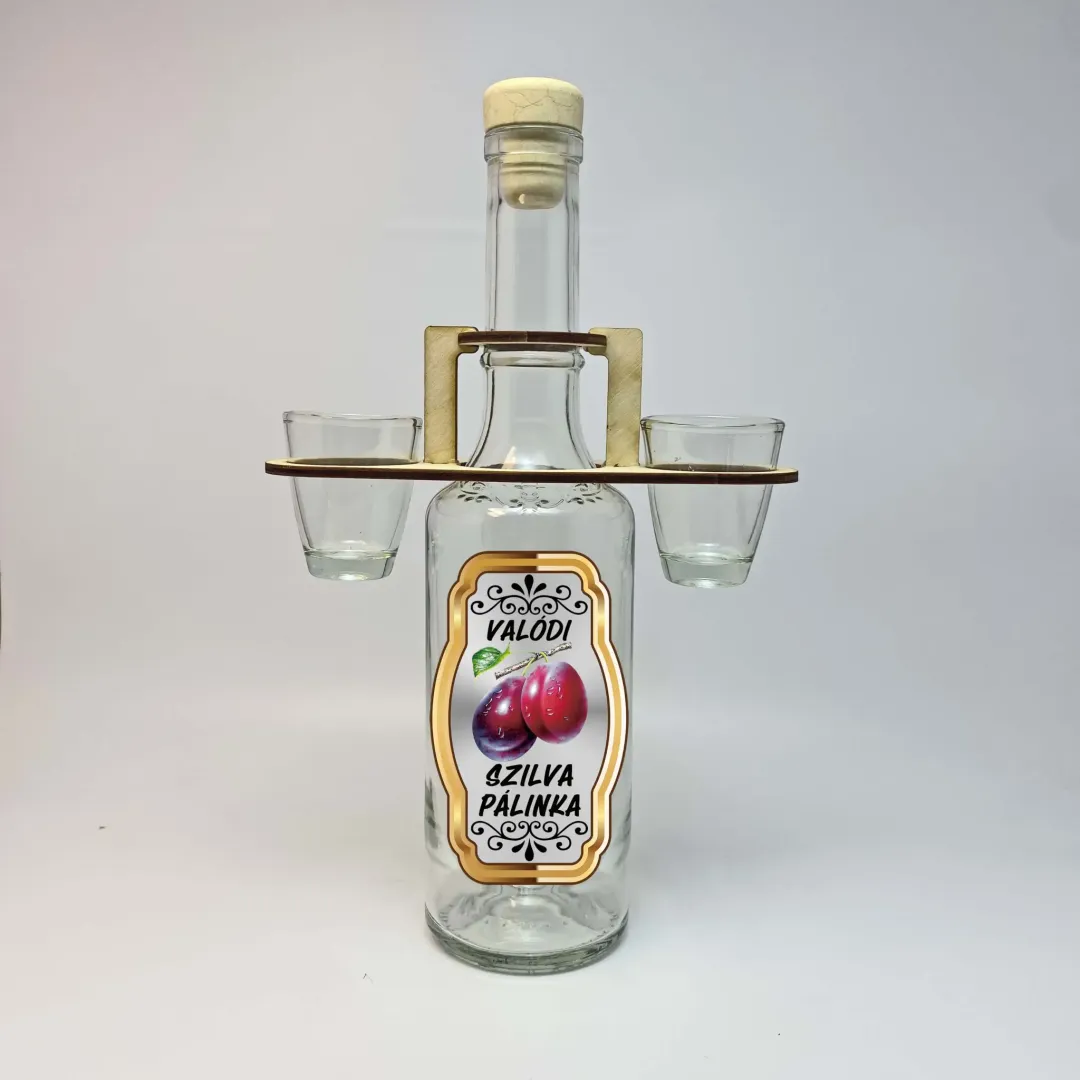 A szett tartalmaz egy 350 ml-es pálinkás üveget, amelyet színes, nyomtatott vízálló matrica díszít Valódi Szilva pálinka felirattal, valamint 2 db 35 ml-es pálinkáspoharat, fa tartóban.