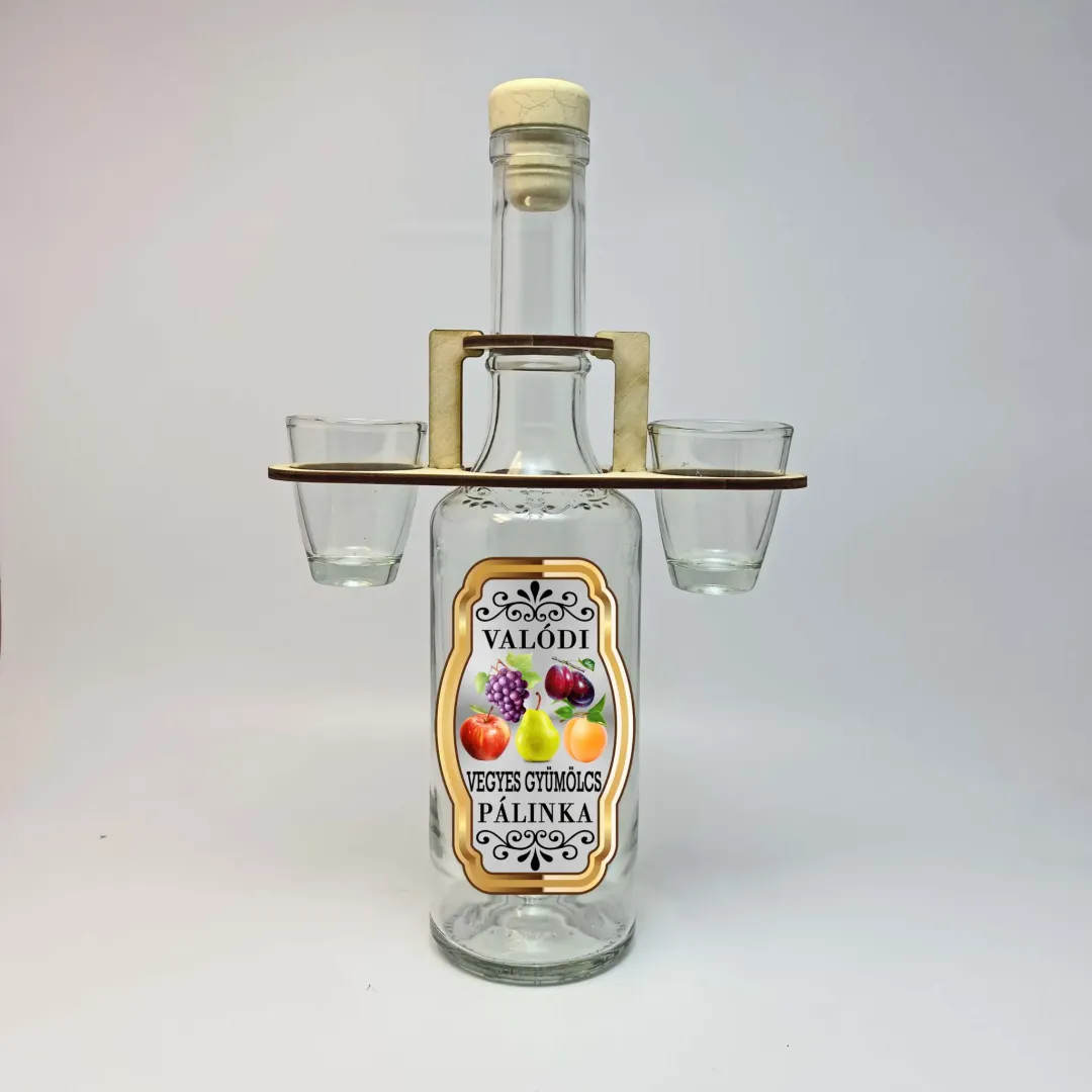 A szett tartalmaz egy 350 ml-es pálinkás üveget, amelyet színes, nyomtatott vízálló matrica díszít Valódi Vegyes Gyümölcs pálinka felirattal, valamint 2 db 35 ml-es pálinkáspoharat, fa tartóban.
