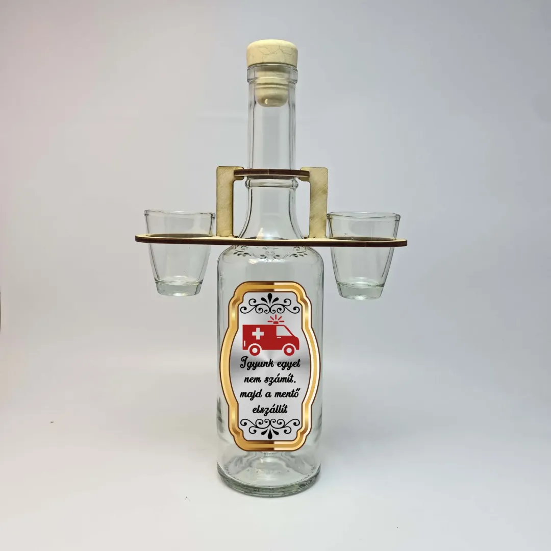A szett tartalmaz egy 350 ml-es pálinkás üveget, amelyet színes, nyomtatott vízálló matrica díszít Igyunk egyet... felirattal, valamint 2 db 35 ml-es pálinkáspoharat, fa tartóban.