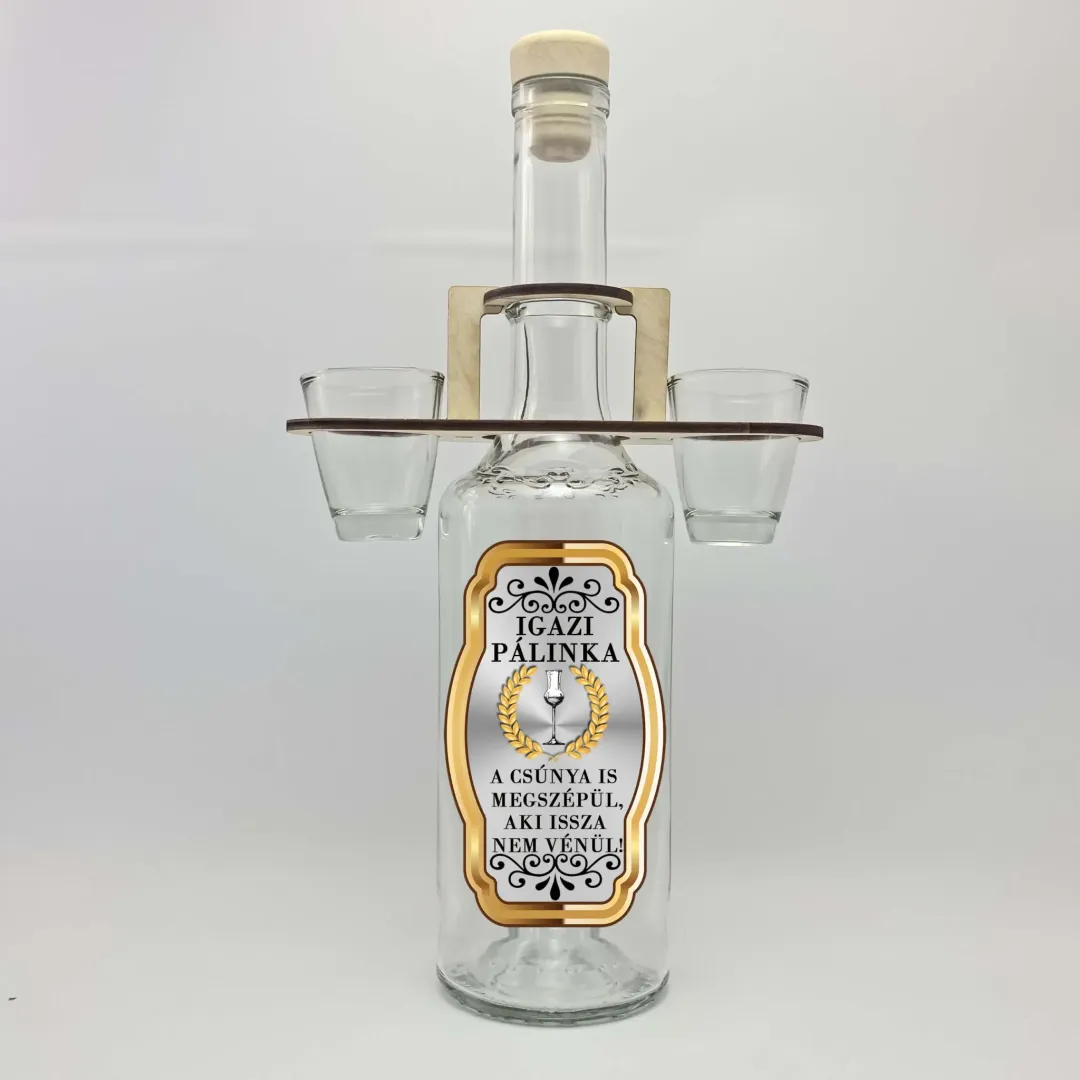 A szett tartalmaz egy 350 ml-es pálinkás üveget, amelyet színes, nyomtatott vízálló matrica díszít Igazi pálinka... felirattal, valamint 2 db 35 ml-es pálinkáspoharat, fa tartóban.
