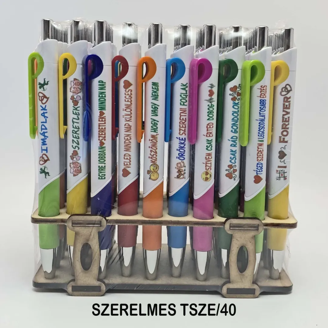 Ez a 40 darabos színes tollkészlet fa tartóban, kifejezetten viszonteladók számára ideális választás. A tollak különböző mintákkal, szerelmes felirattal és élénk színekben érkeznek, így a vásárlók számára változatos és figyelemfelkeltő kínálatot biztosítanak. Bővebben| Cikkszám | TSZER/40 |
